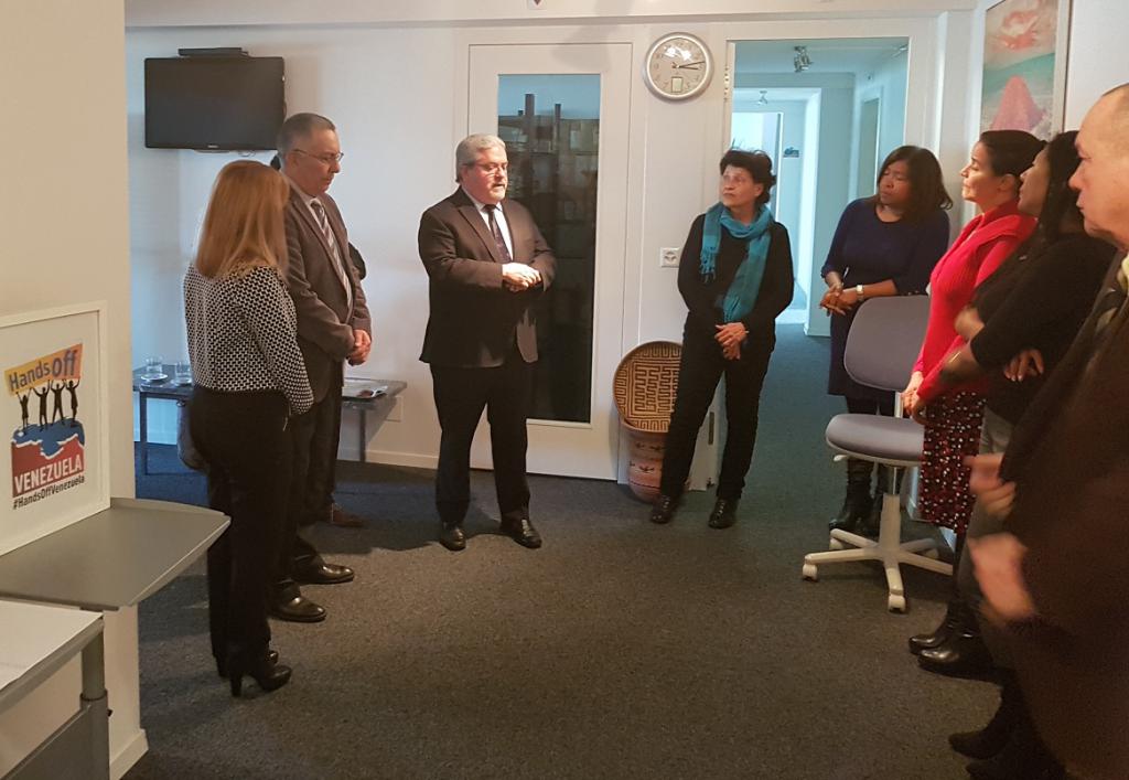 Berna, 20 de febrero de 2018.- El Embajador de Cuba en Suiza, Manuel Aguilera de la Paz, y demás integrantes del colectivo de la misión diplomática cubana, acudieron en la tarde de hoy a la Embajada de la República Bolivariana de Venezuela en Berna, donde todos suscribieron el libro abierto en esa sede diplomática para la recogida de firmas contra la injerencia de los Estados Unidos en el país sudamericano y en respaldo al gobierno constitucional del Presidente Nicolás Maduro Moros. El documento, que lleva anexa la Carta abierta del presidente venezolano al pueblo estadounidense, forma parte de la campaña internacional #HandsOffVenezuela, que constituye un llamado a la paz y al respeto a la soberanía de Venezuela.