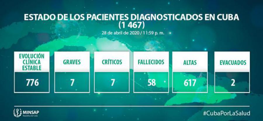 - Ciudadana cubana de 61 años residente en el municipio Playa, La Habana. Contacto de casos confirmados anteriormente. Se mantienen en vigilancia 12 contactos.