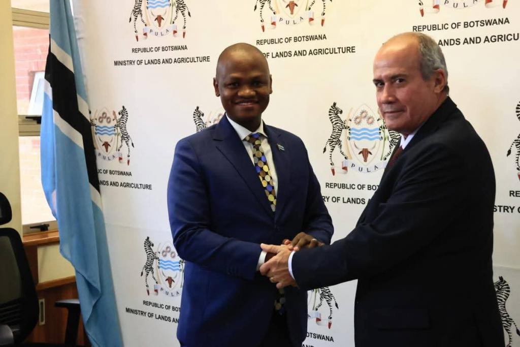 Gaborone, 24 de febrero de 2026.- El embajador cubano Antonio Luis Pubillones Izaguirre fue recibido recientemente en la sede del Ministerio de Tierras y Agricultura por el Ministro del Ramo, el Dr. Edwin Dikolote.
