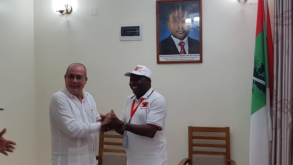 Bujumbura, 27 de enero - AEl embajador cubano Antonio Luis Pubillones en Burundi, participo ayer domingo 26 en el Congreso Extraordinario del Partido Consejo Nacional para la Defensa de la Democracia-Fuerzas de Defensa de la Democracia, celebrado el la ciudad de Gitega, nueva capital política de Burundi. Al finalizar el evento el Secretario General Evariste Ndayishimiye, electo unanimemente por los 1070 delegados al congreso como candidato presidencial para las elecciones a celebrarse el proximo mes de mayo, recibio en la sede del Partido en Gitega al embajador cubano. Momento histórico en el quedo patentizada la amistad entre nuestros partidos y pueblos. Fue propicia la ocasion para que se pudiera saludar e intercambiar con el vicesecretario general y la secretaria nacional de Informacion y Comunicacion del Partido.