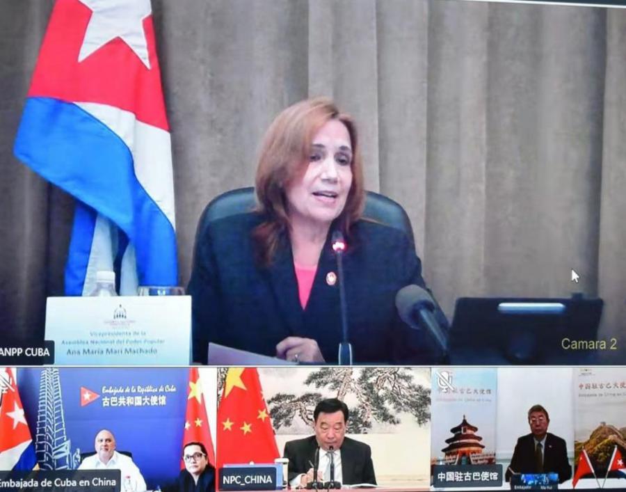 Beijing, 22 de abril de 2022- La vicepresidenta de la Asamblea Nacional del Poder Popular y del Consejo de Estado de la República de Cuba, Ana María Mari Machado, sostuvo este jueves un fraterno intercambio virtual con su homólogo chino, el miembro del Buró Político del Comité Central del Partido Comunista de China y vicepresidente de la Asamblea Popular Nacional, Wang Chen.