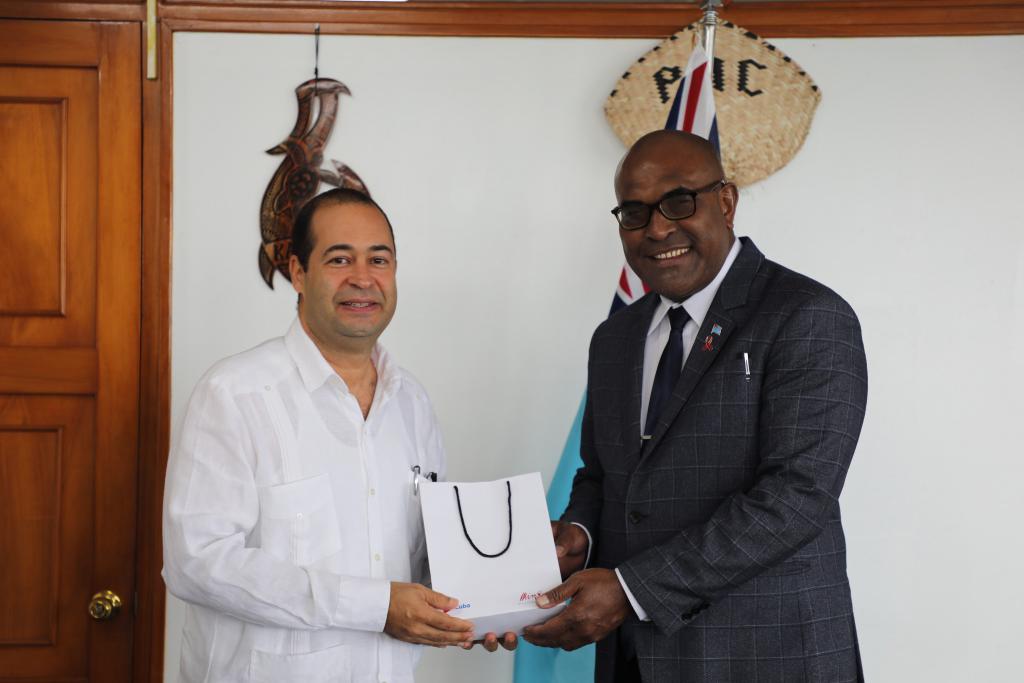 Suva, 13 de marzo 2026.- El Ministro de Salud y Servicios Médicos de Fiyi, Dr. Ratu Atonio Rabici Lalabalavu, recibió al embajador cubano, Nestor Torres Olivera en la sede de ese organismo.