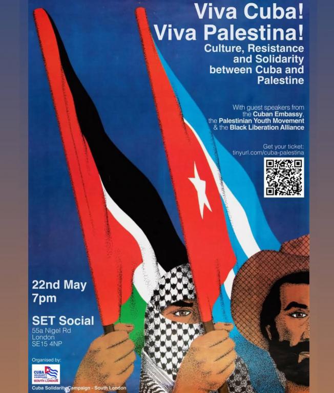 El miércoles 22 de mayo, el Grupo del Sur de Londres de la Campaña de Solidaridad con Cuba organizó una intensa velada de reflexión, resistencia y cultura revolucionaria en el SET Social de Peckham. Bajo el título ¡Viva Cuba! ¡Viva Palestina!, el acto reunió a miembros de la comunidad local, activistas de la solidaridad y representantes de los pueblos cubano y palestino para explorar más de ocho décadas de lucha antiimperialista compartida.