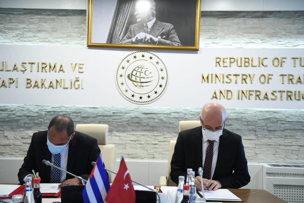 Ankara, 12 noviembre de 2020. El viceministro del Ministerio de Transporte e Infraestructura de Turquía, Selim Dursun, y el embajador cubano acreditado en esta capital, Luis A. Amorós Núñez, firmaron hoy el Acuerdo Marítimo entre los gobiernos de ambos países, en la sede de la institución turca. En la ceremonia participaron directivos y funcionarios del referido ministerio y de la Cancillería turca, así como funcionarios de la Misión cubana.