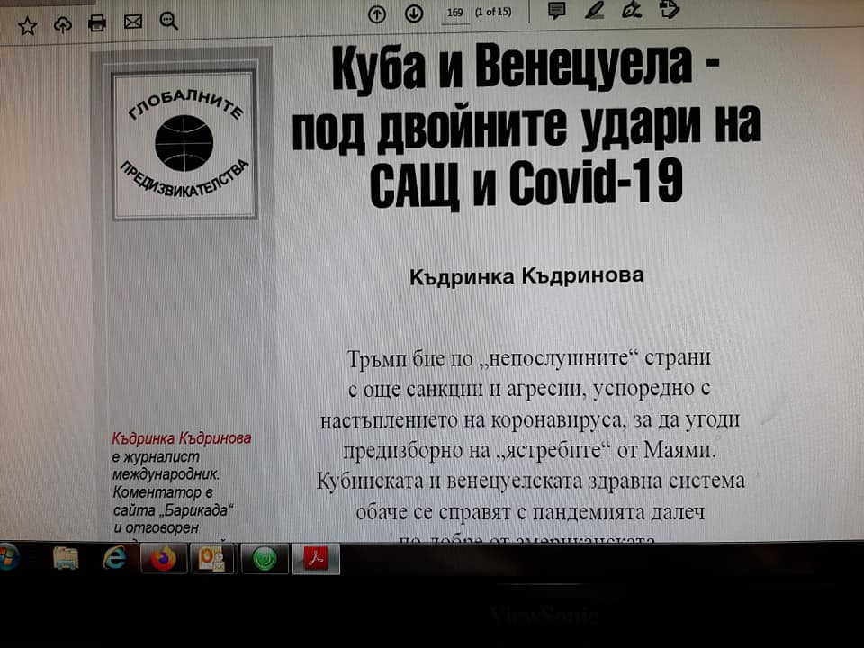 Bajo el título "Cuba y Venezuela: bajo el doble azote del Covid-19 y de EE.UU", el sitio web de la revista semanal Novo vreme publica hoy una extensa crónica, de la autoría de la periodista búlgara Kadrinka Kadrinova, presidenta de la Unión de Periodistas Hispanohablantes de Bulgaria.