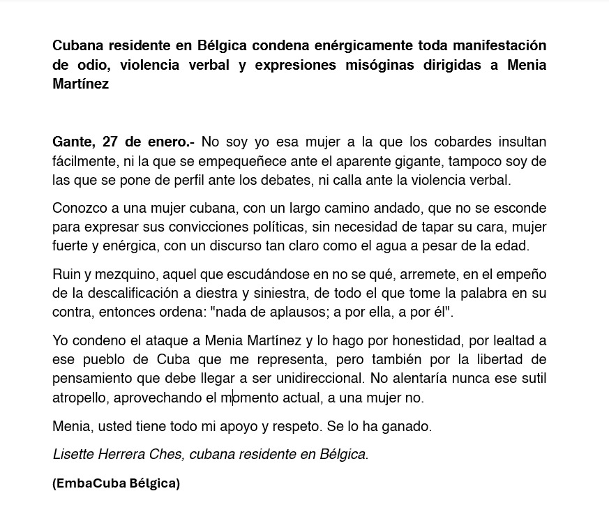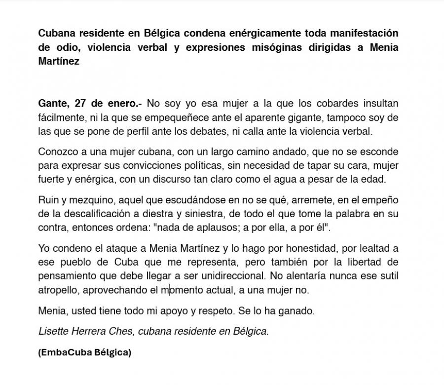 Yo condeno el ataque a Menia Martínez y lo hago por honestidad, por lealtad a ese pueblo de Cuba que me representa, pero también por la libertad de pensamiento que debe llegar a ser unidireccional. No alentaría nunca ese sutil atropello, aprovechando el momento actual, a una mujer no.