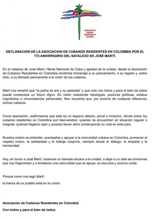 La Asociación de Cubanos Residentes en Colombia rindió homenaje este 28 de enero al legado de José Martí, en el 173 aniversario de su natalicio. Con una declaración pública, la organización reafirmó su compromiso con la unidad de la comunidad cubana, más allá de ideologías, estatus migratorio o tiempo de residencia.