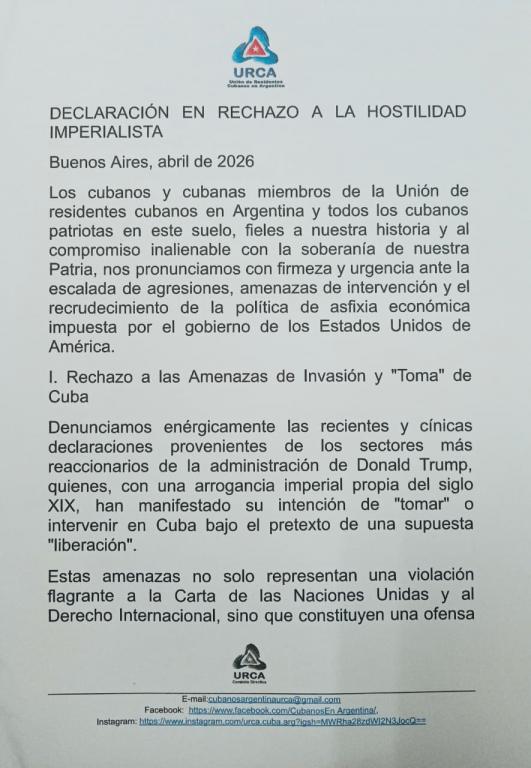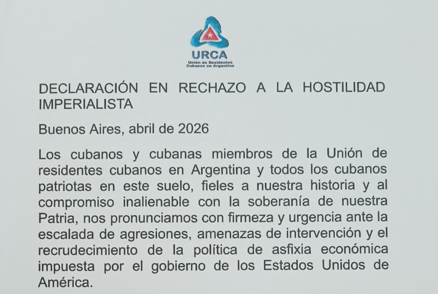 Buenos Aires, 17 de abril de 2026 - En una declaración emitida este jueves, la Unión de Residentes Cubanos en Argentina (URCA) y cubanos patriotas residentes en suelo argentino rechazaron la hostilidad imperialista, exigieron el cese de las amenazas de invasión, el fin del bloqueo del gobierno estadounidense contra Cuba y el respeto a la autodeterminación del pueblo cubano.