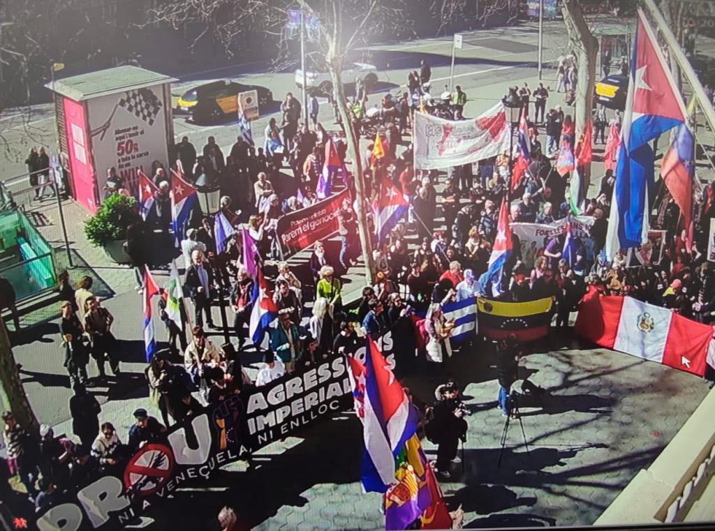 Barcelona, Cataluña. 24 de febrero de 2026: Cubanos residentes en Barcelona, junto a amigos de la Solidaridad con Cuba en Cataluña, protagonizaron una marcha frente al Consulado General de Cuba, en firme denuncia contra la agresiva y criminal escalada del gobierno de los Estados Unidos contra nuestro país. La movilización constituyó una clara expresión de apoyo a la Revolución Cubana y de rechazo al bloqueo económico, comercial y financiero impuesto por más de seis décadas.