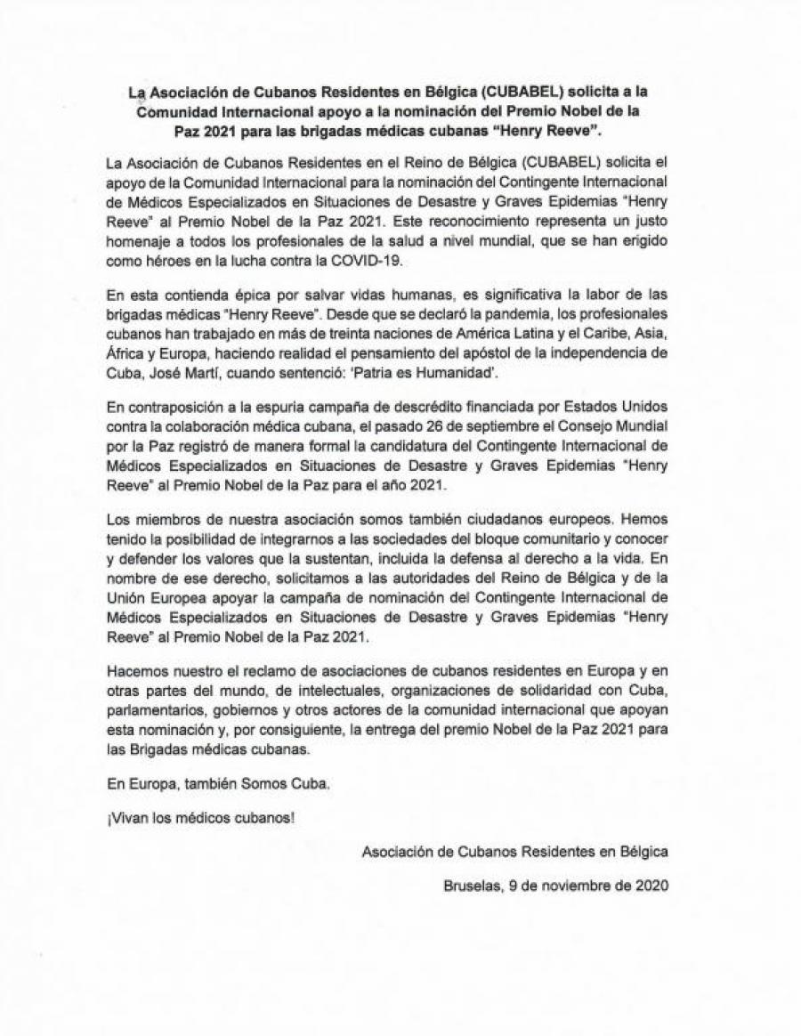 Cubanos residentes en Bélgica solicitan apoyo a la nominación de la Brigada de médicos cubanos "Henry Reeve"