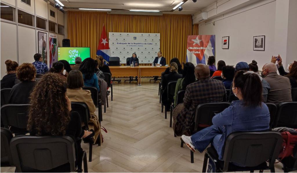 En el encuentro se reafirmó el compromiso de nuestros connacionales residentes en Italia con su nación. Se rechazó el bloqueo económico, comercial y financiero impuesto por el gobierno de EE.UU. y otras medidas coercitivas unilaterales. Se ratificó la importancia de defender la soberanía de Cuba y dar la batalla para desmontar todas las campañas que circulan en redes sociales con el objetivo de dañar la imagen del país (@ConsulCubaRoma).