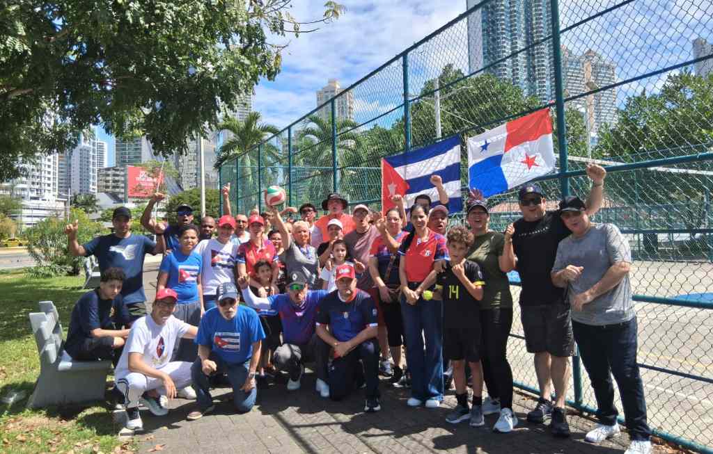 Ciudad de Panamá, 22 de marzo de 2026. Panameños, integrantes de la misión estatal de la isla junto a connacionales residentes en el istmo, confraternizaron hoy en un tope amistoso de voleibol que también sirvió para condenar el bloqueo de Estados Unidos.