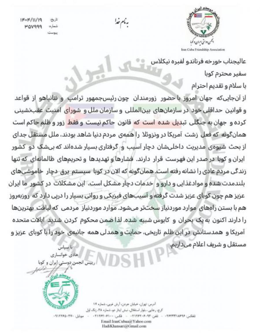 De la misma manera que actualmente en Cuba el sistema eléctrico se ve afectado por apagones prolongados y el acceso a alimentos, medicamentos y servicios esenciales enfrenta serias dificultades, estas mismas problemáticas se han intensificado en nuestro querido Irán, al igual que en la estimada Cuba, generando profundos daños físicos y psicológicos, los cuales se agravan día a día con el cierre de las vías de acceso a los bienes y necesidades básicas. Las necesidades de pueblos que merecen lo mejor hoy se han convertido en una crisis y una verdadera pesadilla.