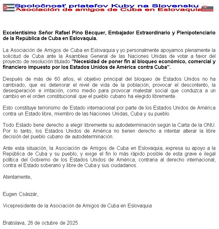 Bratislava, 27 de octubre de 2025 - La Asociación de Amigos de Cuba en Eslovaquia, emitió Declaración de apoyo a la República de Cuba y su pueblo, donde exige el fin del bloqueo del Gobierno de los Estados Unidos de América contra el Estado soberano y libre de Cuba y sus ciudadanos.