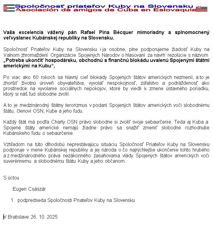 Spoločnosť Priateľov Kuby na Slovensku i ja osobne, plne podporujeme žiadosť Kuby na Valnom zhromaždení Organizácie Spojených Národov o hlasovaní za návrh rezolúcie s názvom „Potreba ukončiť hospodársku, obchodnú a finančnú blokádu uvalenú Spojenými štátmi americkými na Kubu“,