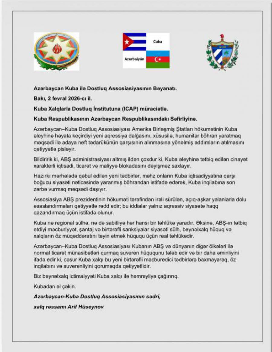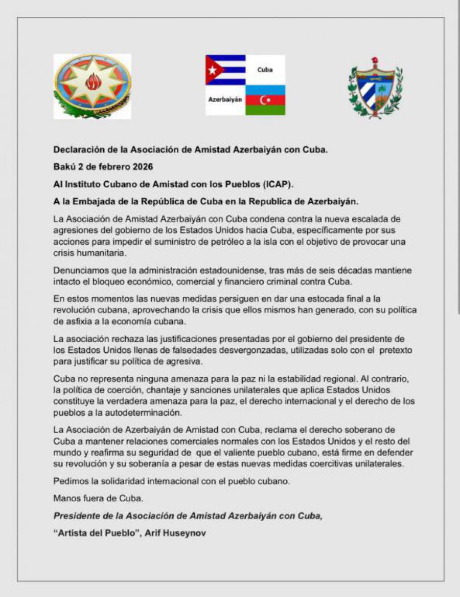 La Asociación de Azerbaiyán de Amistad con Cuba, reclama el derecho soberano de Cuba a mantener relaciones comerciales normales con los Estados Unidos y el resto del mundo y reafirma su seguridad de que el valiente pueblo cubano, está firme en defender su revolución y su soberanía a pesar de estas nuevas medidas coercitivas unilaterales.