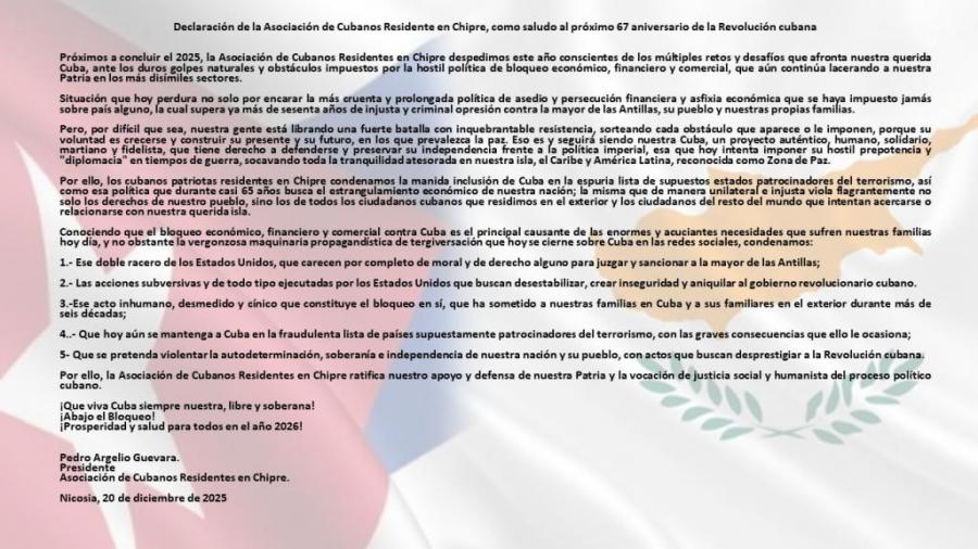Próximos a concluir el 2025, la Asociación de Cubanos Residentes en Chipre despedimos este año conscientes de los múltiples retos y desafíos que afronta nuestra querida Cuba, ante los duros golpes naturales y obstáculos impuestos por la hostil política de bloqueo económico, financiero y comercial, que aún continúa lacerando a nuestra Patria en los más disímiles sectores.