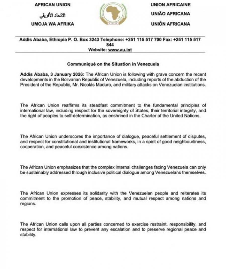 Addis Ababa, 3 de enero de 2026.- La Unión Africana sigue con profunda preocupación los recientes acontecimientos en la República Bolivariana de Venezuela, incluidos los informes sobre el secuestro del Presidente de la República, Sr. Nicolás Maduro, así como ataques militares contra instituciones venezolanas.