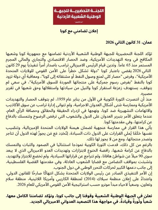 El Comité Preparatorio del Frente Popular Nacional Jordano afirma su solidaridad con la República de Cuba y su pueblo en lucha ante las amenazas estadounidenses y el criminal bloqueo económico, comercial y financiero que persiste desde hace 65 años. Condena la orden ejecutiva emitida por el presidente imperialista Trump el 29 de enero de 2016, que designa a Cuba como "país que representa una amenaza para la seguridad nacional de los Estados Unidos de América" e impone un "bloqueo total para impedir el suministro de petróleo o sus derivados a Cuba, y penaliza a cualquier país que suministre petróleo a Cuba mediante la imposición de aranceles a sus productos importados al mercado estadounidense". Esto forma parte de un esfuerzo continuo para desestabilizar a Cuba y socavar su soberanía, independencia y el derecho de su pueblo a la autodeterminación.