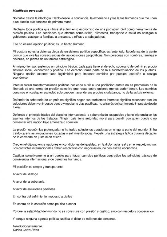 Rechazo toda política que utilice el sufrimiento económico de una población civil como herramienta de presión política. Las sanciones que afectan combustible, alimentos, transporte o salud no castigan a gobiernos: castigan a familias, a ancianos, a niños y a trabajadores.