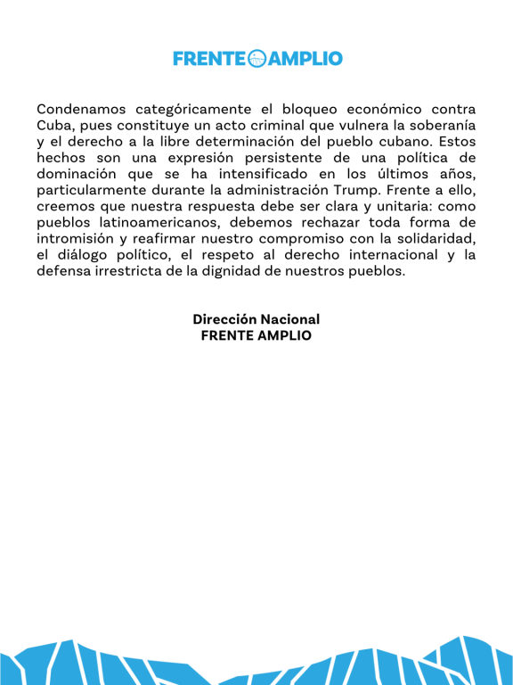 Condenamos categóricamente el bloqueo contra Cuba, pues constituye un acto criminal que vulnera la soberanía y el derecho a la libre determinación del pueblo cubano. Estos hechos son una expresión persistente de una política de dominación que se ha intensificado en los últimos años, particularmente durante la administración Trump. Frente a ello, creemos que nuestra respuesta debe ser clara y unitaria: como pueblos latinoamericanos, debemos rechazar toda forma de intromisión y reafirmar nuestro compromiso con la solidaridad, el diálogo político, el respeto al derecho internacional y la defensa irrestricta de la dignidad de nuestros pueblos.