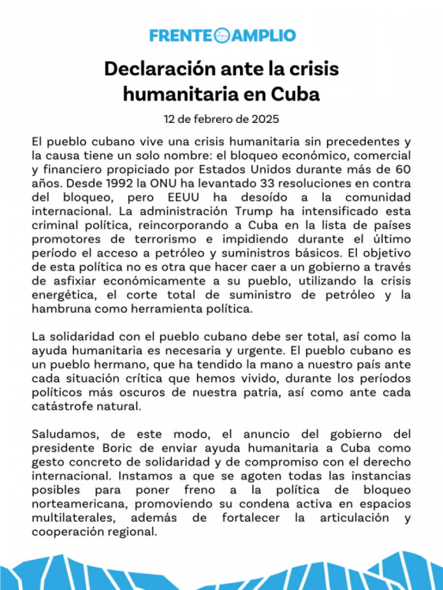 Saludamos de este modo, el anuncio del gobierno del presidente Boric de enviar ayuda humanitaria a Cuba como gesto concreto de solidaridad y de compromiso con el derecho internacional. Instamos a que se agoten todas las instancias posibles para poner freno a la política de bloqueo norteamericana, promoviendo su condena activa en espacios multilaterales, además de fortalecer la articulación y cooperación regional.