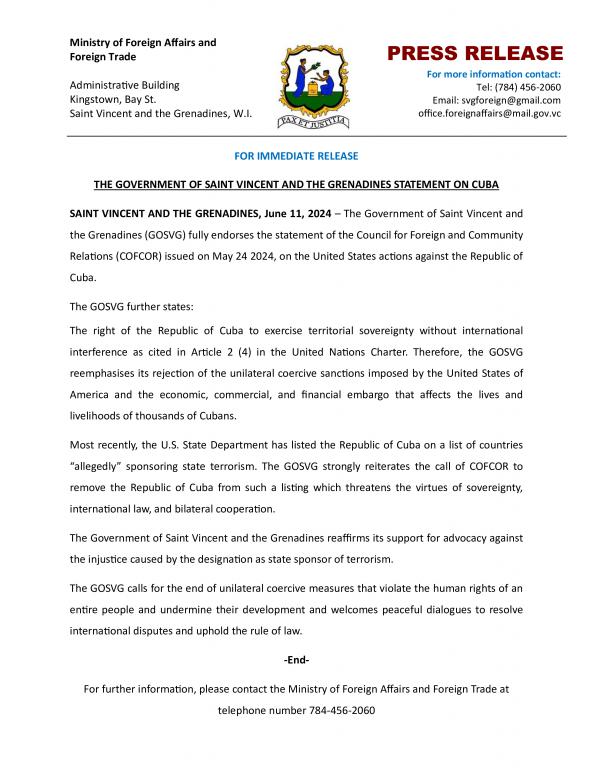 El Gobierno de San Vicente y las Granadinas (GOSVG) respalda plenamente la declaración del Consejo de Relaciones Exteriores y Comunitarias (COFCOR) emitida el 24 de mayo de 2024, sobre las acciones de los Estados Unidos contra la República de Cuba.