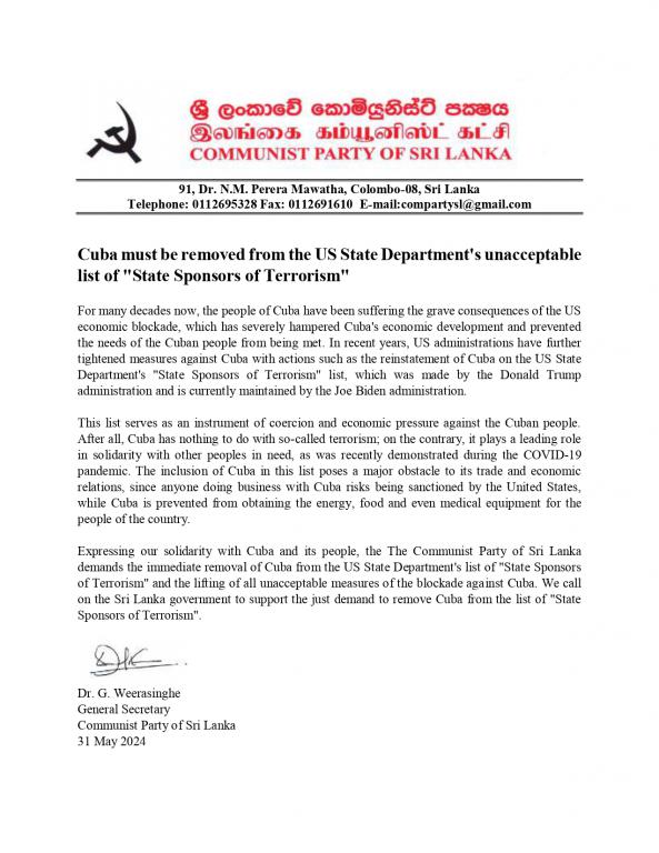 El Partido Comunista de Sri Lanka exige la inmediata eliminación de Cuba de la lista del Departamento de Estado de Estados Unidos de "Estados Patrocinadores del Terrorismo" y el levantamiento de todas las medidas inaceptables del bloqueo contra Cuba. Hacemos un llamado al gobierno de Sri Lanka para que apoye la justa demanda de sacar a Cuba de la lista de "Estados patrocinadores del terrorismo".