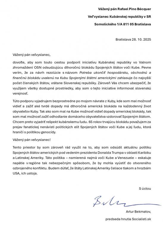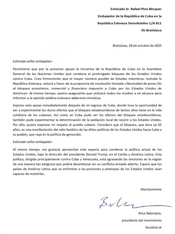 Declaración del Partido Socialisti.sk en apoyo a la resolución cubana titulada “Necesidad de poner fin al bloqueo económico, comercial y financiero impuesto por los EEUU contra Cuba”