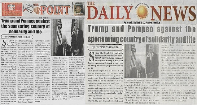 Bajo el título, Trump y Pompeo contra el país patrocinador de la solidaridad y la vida, los dos cotidianos de esta nación del occidente africano señalan que ambos futuros desempleados de la Casa Blanca siguen obsesionados con la Revolución cubana porque soñaron con derrocarla y no lo lograron, como tampoco lo pudieron hacer todos sus predecesores en los últimos 60 años.
