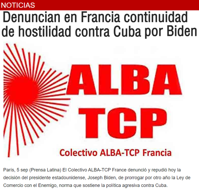 De acuerdo con el Colectivo ALBA-TCP France, extender la Ley de Comercio con el Enemigo en relación con la isla es un acto de injerencia que debe revertirse de inmediato.