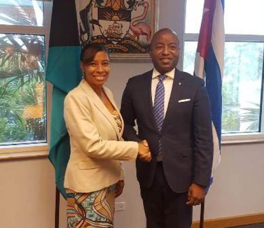 LAS BAHAMAS, 18 de septiembre de 2018.- A solo unas semanas de la votación de la resolución cubana contra el bloqueo en la Asamblea General de la ONU, la embajadora de Cuba en Las Bahamas, Ismara Vargas Walter, intercambió con el Canciller bahamés, Honorable Darren Allan Henfield, sobre los efectos del bloqueo económico, comercial y financiero impuesto por los Estados Unidos contra Cuba.