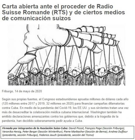 En una carta abierta dirigida a RTS y a medios de comunicación helvéticos, amigas y amigos de nuestro país, miembros de la Asociación Suiza-Cuba, condenaron la subordinación de este medio a la campaña de calumnias y mentiras contra la cooperación médica internacionalista cubana, en particular en la actual lucha contra la COVID-19. (Ver texto ínetgro en: español y francés)