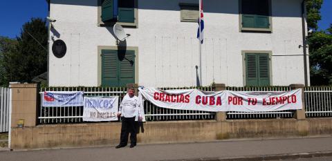 Hasta la sede diplomática cubana en Berna, igualmente llegaron este domingo las muestras de apoyo a Cuba y la colaboración médica solidaria que brinda. Con pancartas de “Solidaridad con Cuba”, “Gracias Cuba por tu ejemplo” y otros, el también miembro de la Coordinación Nacional de la ASC, Samuel Wanitsch, manifestó su desacuerdo con los ataques mediáticos contra la ayuda cubana en tiempos de pandemia. Dicho sentimiento quedó resumido en el mensaje de su camiseta: "Conmigo no cuentes para hablar mal de Cuba".