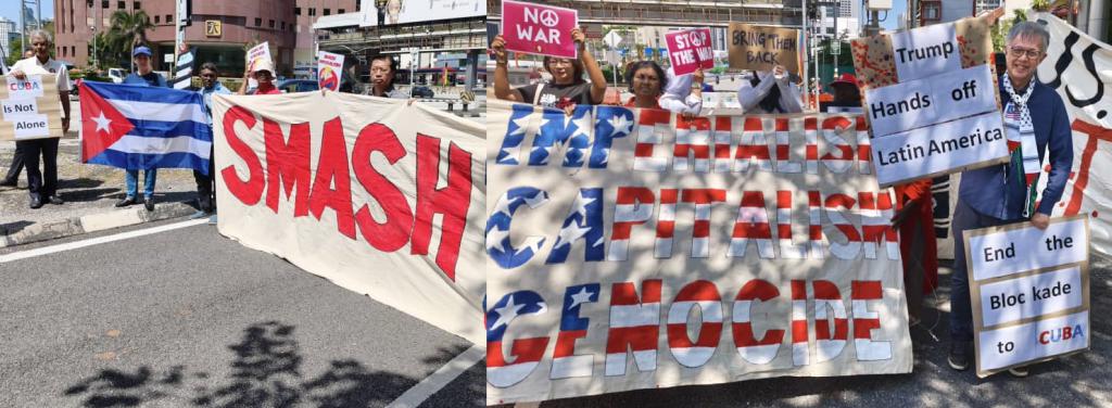 Los participantes portaron carteles afirmando: Cuba no está sola; exigiendo el Fin del Bloqueo a Cuba; demandando Trump Manos fuera de Latinoamérica; Queremos de vuelta al Presidente Nicolás Maduro y su esposa Cilia, y condenando las acciones genocidas del imperialismo norteamericano.