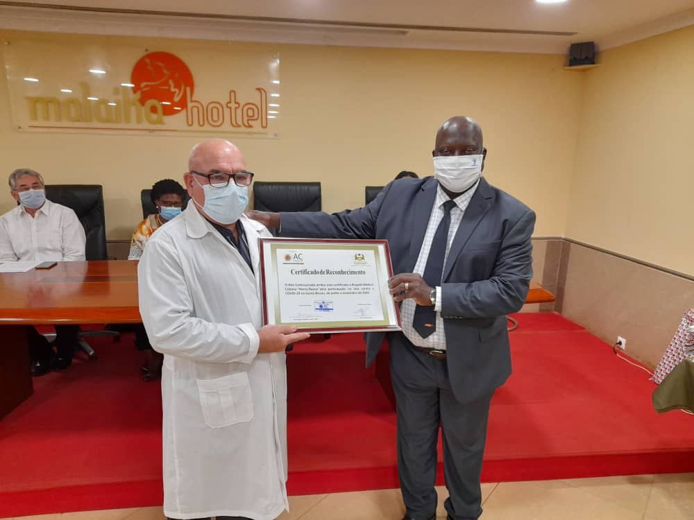 Como agradecimiento a la labor realizada, el Ministro de Salud y la Alta Comisionada entregaron un reconocimiento a la brigada médica y a cada uno de sus integrantes, por su activa y decisiva participación durante cinco meses en el enfrentamiento a la COVID-19 junto al personal del sistema de salud guineense. Le fue entregado además un paño típico del país “pano di pinti”, tejido sagrado de Guinea Bissau.