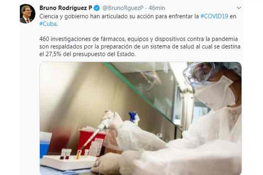En un mensaje publicado en su cuenta en Twitter, el titular de la diplomacia precisó que 460 investigaciones de fármacos, equipos y dispositivos contra la pandemia son respaldados por la preparación de un sistema de salud al cual se destina el 27,5 por ciento del presupuesto del Estado.