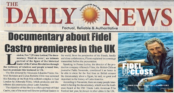 Banjul, 8 nov.- El diario gambiano Daily News destaca hoy el estreno en el Reino Unido del documental “Fidel de Cerca”, un retrato íntimo de la figura del líder histórico de la Revolución Cubana a través del testimonio de familiares y personas de su entorno.
