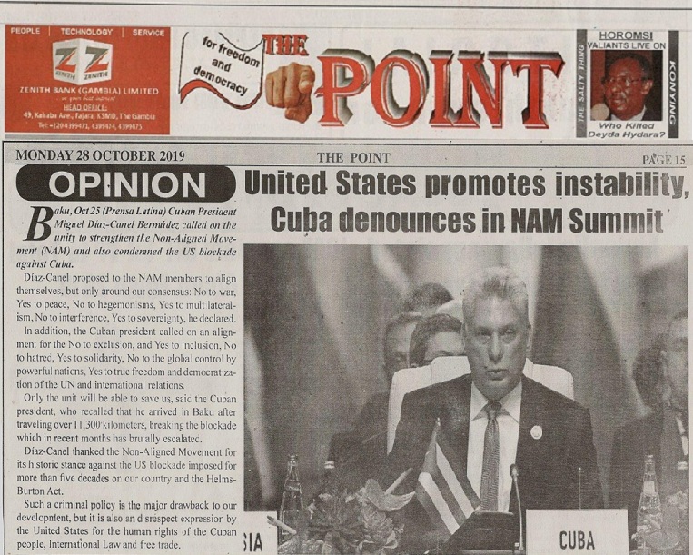 Banjul, 28 oct.- El diario gambiano The Point resaltó en su edición impresa de este lunes la intervención del presidente cubano, Miguel Diaz-Canel, en la recién concluida Cumbre del Movimiento de Países No Alineados (MNOAL), en la que reiteró su denuncia contra el arreciado bloqueo de Estados Unidos a la mayor de las Antillas.