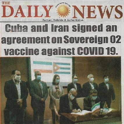 Banjul, 11 ene.- Con llamado a portada, el diario gambiano Daily News destaca hoy la firma de un acuerdo entre Cuba e Irán relacionado con el proyecto vacunal Soberana 02 contra la Covid19, que avanza en la mayor de las Antillas.