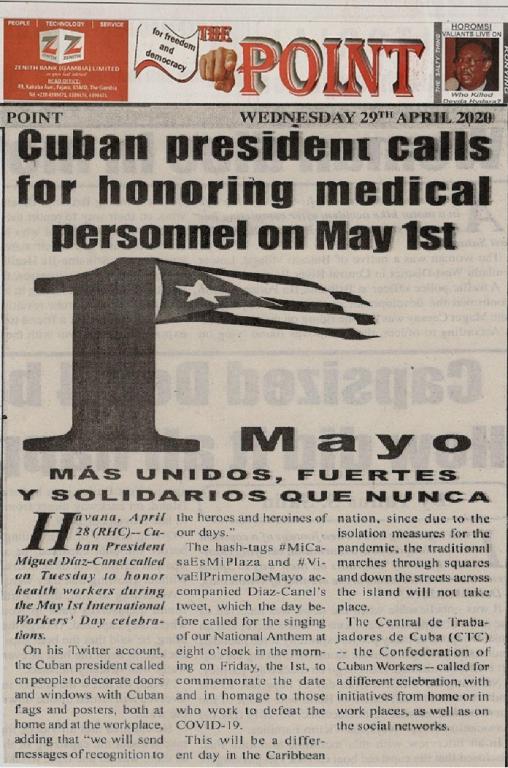 Banjul, 29 abril. – El periódico gambiano The Point difundió en su edición impresa de hoy un llamado del presidente cubano, Miguel Diaz-Canel, a honrar a todos los hombres y mujeres que laboran en el sector de la salud, en ocasión el 1 de Mayo del Dia Internacional de los Trabajadores.