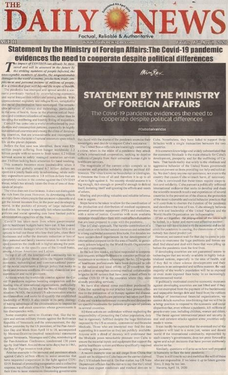 Banjul, 17 abril. – Bajo el titulo “la pandemia demuestra la necesidad de cooperación pese a las diferencias políticas”, el diario gambiano Daily News difunde hoy íntegramente una Declaración del Ministerio de Relaciones Exteriores de Cuba sobre la Covid-19 y la grave crisis que vive actualmente la humanidad.