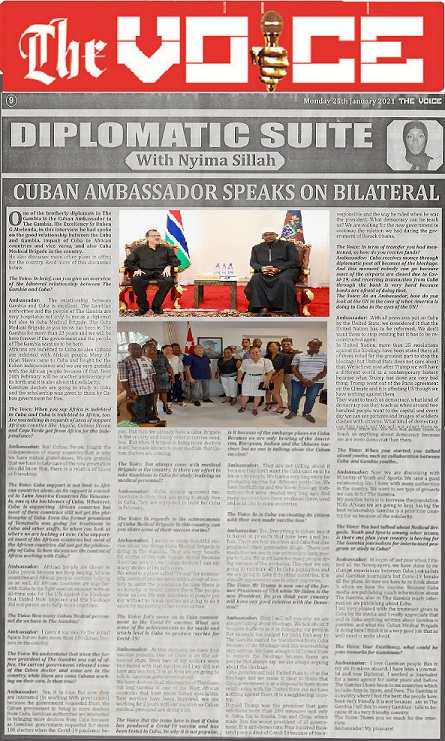 Banjul, 25 ene.- El diario The Voice publicó hoy una extensa entrevista en exclusiva al embajador cubano en Gambia, Rubén G. Abelenda, en la que el diplomático abordó las positivas relaciones entre las dos naciones, el bloqueo de EE.UU. a su país, y la histórica labor solidaria de la mayor de las Antillas con el continente africano, entre otros temas.