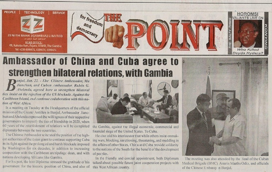 Banjul, 23 ene.- Los diarios gambianos The Point y The Voice destacaron hoy en sus ediciones impresas y digitales el encuentro que sostuvieron los embajadores de China y Cuba en esta nación africana con el propósito de estrechar las relaciones mutuas, mantener la lucha contra el injusto bloqueo de Estados Unidos a Cuba y continuar la copèración conjunta de ambos países con Gambia.