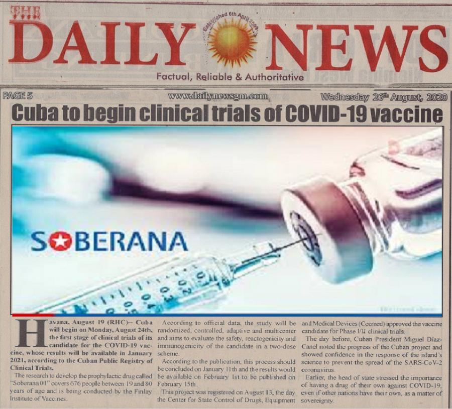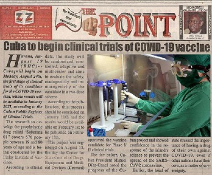 Banjul, 26 agosto. – El comienzo de los ensayos clínicos de la vacuna cubana “Soberana 01” contra la Covid-19 fue dado a conocer hoy por el diario gambiano Daily News, como igual lo hizo con anterioridad su similar The Point.