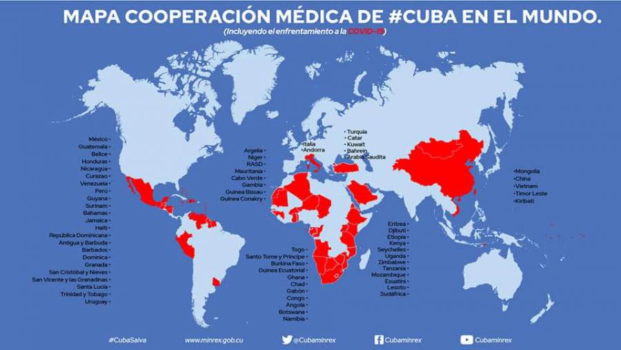 Y eso se ha logrado sin renunciar a la práctica internacionalista de compartir lo que tenemos. La descomunal y mendaz campaña del gobierno de los Estados Unidos contra la colaboración médica cubana, que privó de servicios de salud a poblaciones vulnerables de Brasil, Bolivia y Ecuador, donde la pandemia está provocando fuertes estragos, ha sido derrotada. En este instante, 34 brigadas médicas cubanas integradas por más de 2 mil 500 cooperantes contribuyen de manera solidaria a mitigar el impacto de la pandemia en 26 naciones, a pedido de sus gobiernos. Ellos se suman a los más de 28 mil profesionales de la salud que ya prestaban servicios en 59 países antes de la #COVID19.