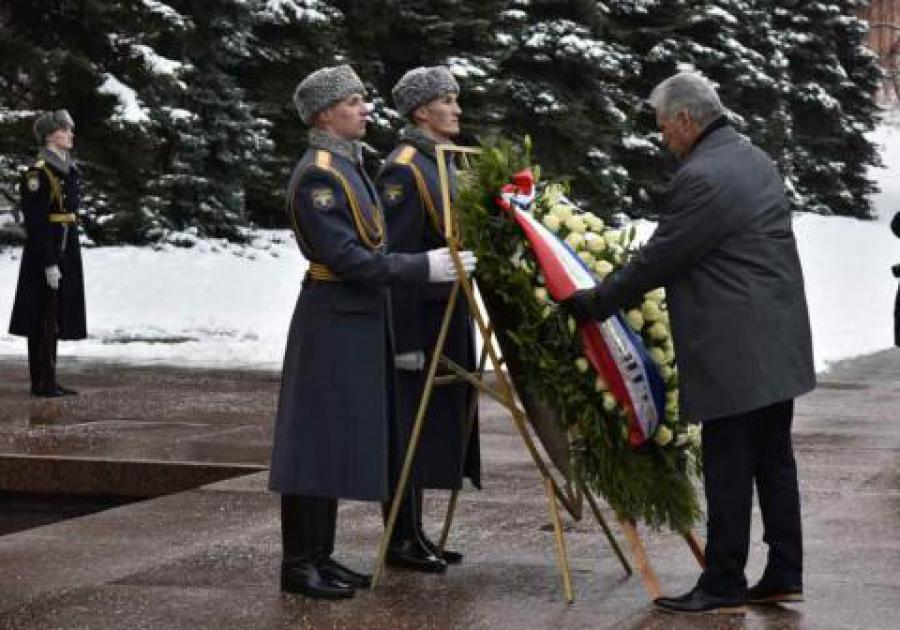 En el sitio histórico de obligatoria visita para todo el que llega a Moscú, el jefe de Estado cubano depositó una ofrenda floral para homenajear a los caídos en los enfrentamientos contra la Alemania nazi en la Segunda Guerra Mundial.