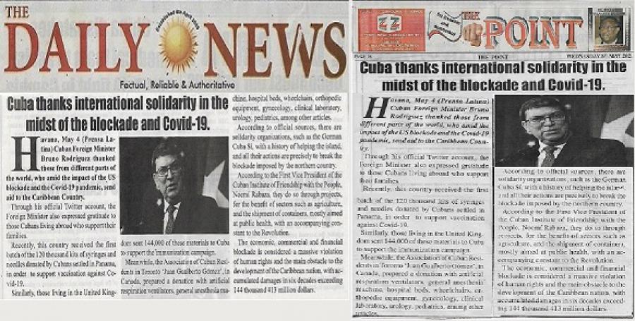 Banjul, 5 mayo. - Los diarios gambianos Daily News y The Point se hicieron eco hoy del agradecimiento de Cuba a quienes desde todos los continentes, y en medio del impacto la Covid-19 y del cruel bloqueo de EE.UU., envían ayudas solidarias a la isla caribeña.