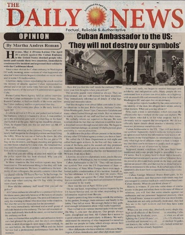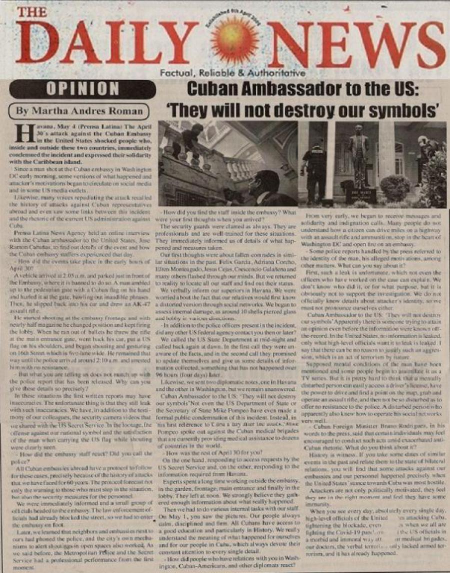 Banjul, 6 mayo.- El diario gambiano Daily News difunde hoy una entrevista al embajador de Cuba en Estados Unidos, José Ramón Cabañas, en la que denuncia el ataque terrorista perpetrado el pasado 30 de abril contra la sede diplomática de la mayor de las Antillas en Washington.