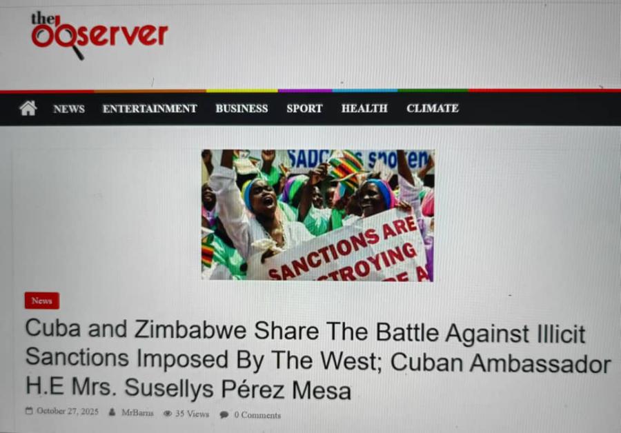 Harare, 27 de octubre de 2025 – Los diarios The Observer y The Herald dieron hoy amplia difusión a los mensajes de dirigentes de Cuba sobre el bloqueo y las medidas coercitivas unilaterales y las declaraciones de la Embajadora en Zimbabwe, Excma Sra. Susellys Pérez Mesa.